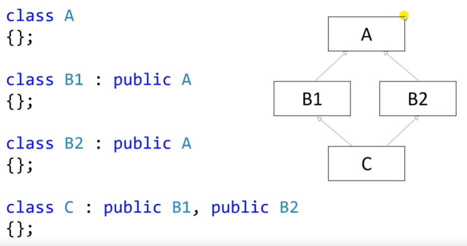 사진에 보이는 그대로 C가 B1과 B2를 상속받고 있으며, B1과 B2도 A를 상속받고 있다. 이러한 다이아 모양의 상속을 피해야 하는 방법중 하나이다. 무조건 기피하라는것은 아니라 하셨다. 우리가 사용하는 cin과 cout도 이러한 다이아 상속이라 알려주셨다.
