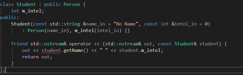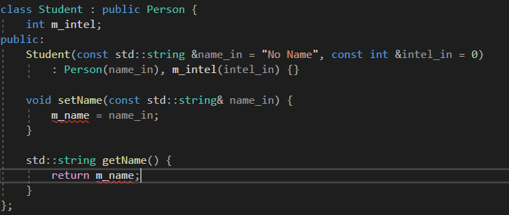 setName과 getName함수가 Person class안으로 들어가 있는것을 확인할 수 있다. 추가로 m_intel변수의 경우 각 학생마다의 지적능력의 지표이다. 이는 학생이 갖는 속성이기에 Person class로 옮겨서는 안된다.