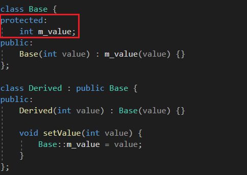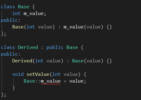 Derived class에서 setValue함수가 Base의 멤버변수인 m_value를 바꾸려 시도하고 있다. m_value는 private라 접근이 불가능 한 상황이다. 이럴때는 멤버변수의 접근 지정자를 protected로 바꾸면 접근이 가능해진다.