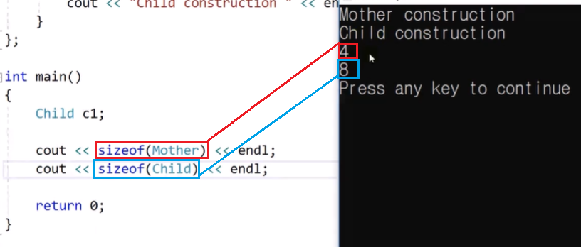 Child class는 Mother class를 상속받았으며 이로인해 Child class의 구현 부분이 비어있음에도 Mother에서 사용하던 member function들을 사용할수가 있다.