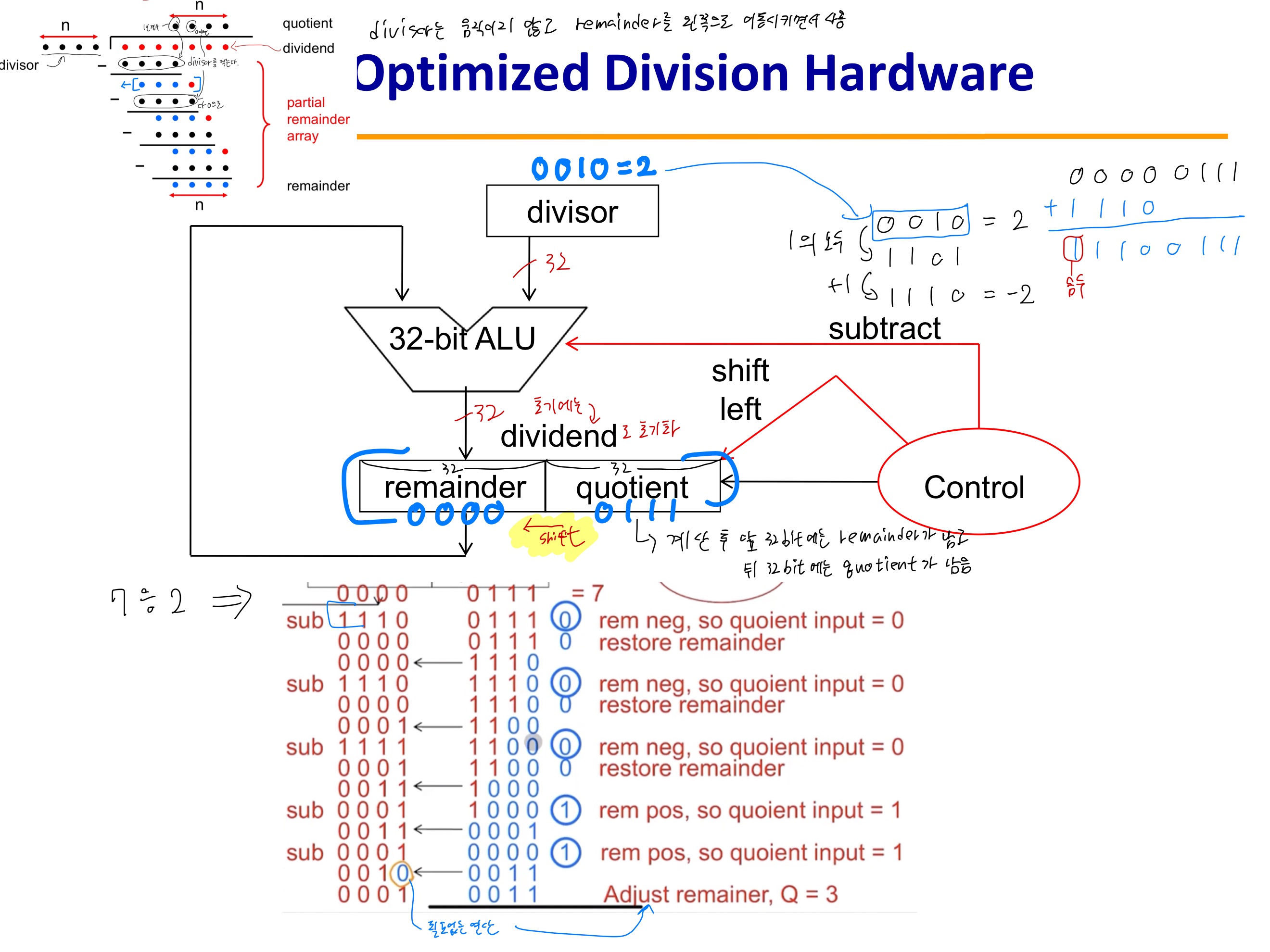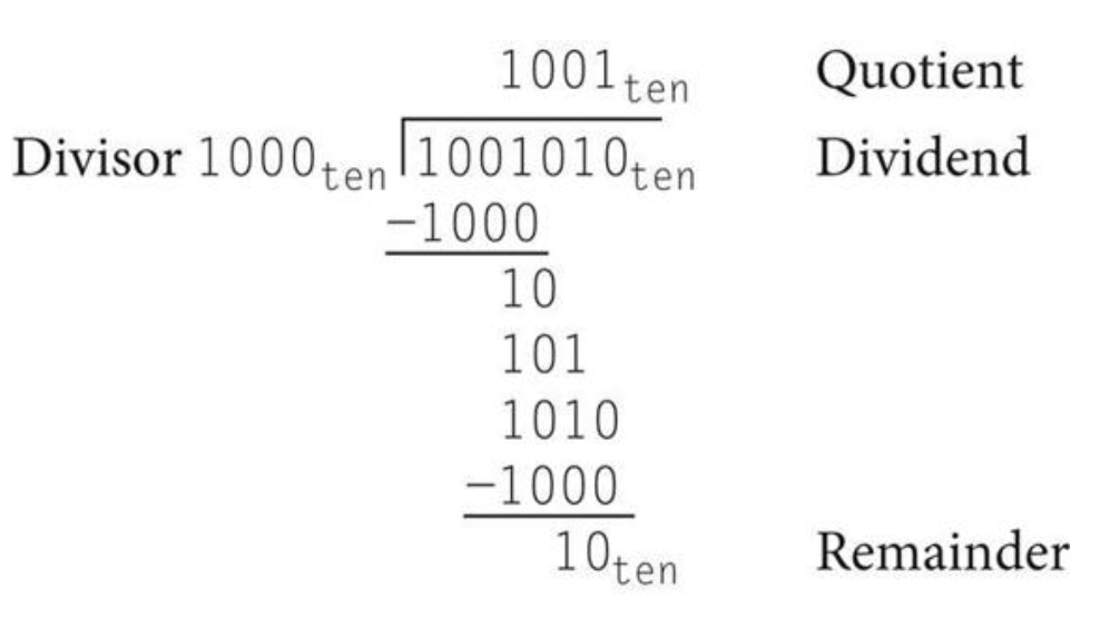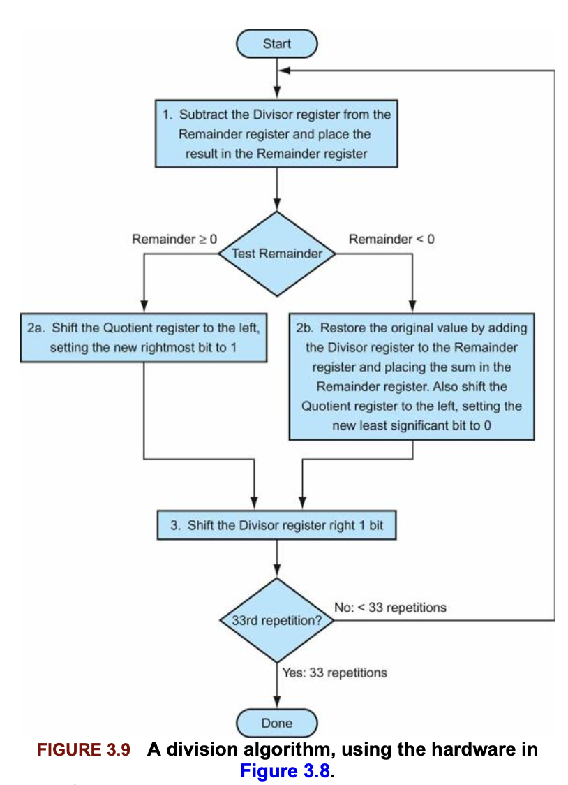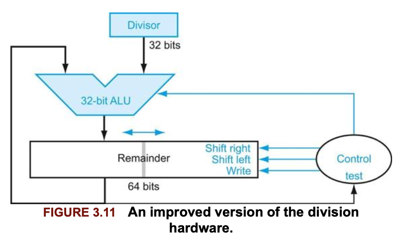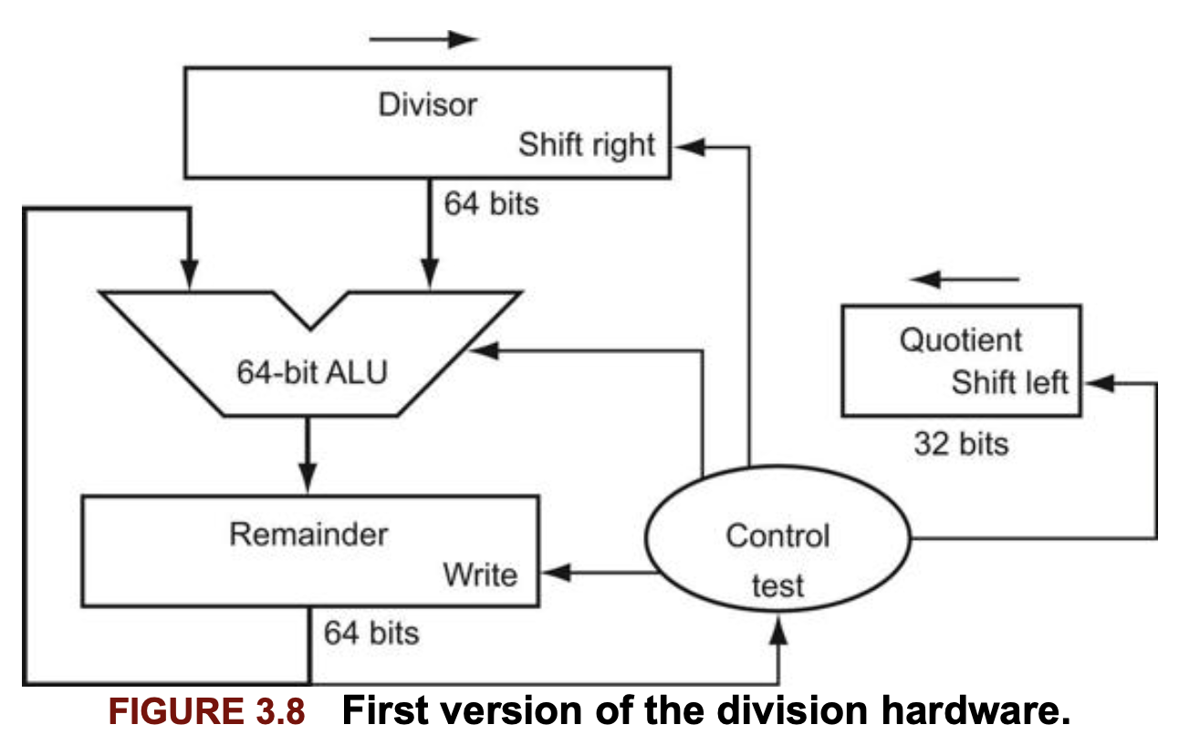이 알고리즘은 매 반복마다 제수(divisor)를 오른쪽으로 한 비트씩 자리이동해야 하므로 제수를 64비트 제수 레지스터의 왼쪽 절반에 넣고 시작한다. 그리고 피제수와 자리를 맞추기 위해 반복할 때마다 오른쪽으로 한 비트씩 자리이동한다. remainder 레지스터는 피제수(dividend)로 초기화 된다.
