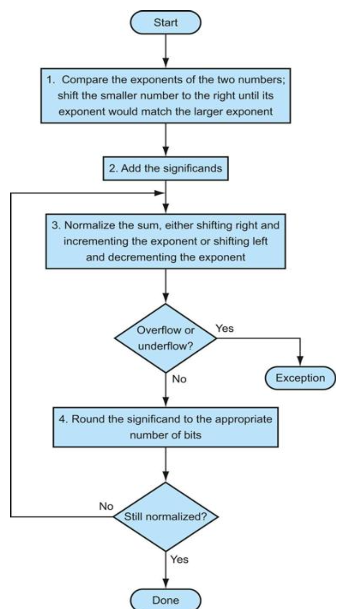 다음 플로우 차트는 이진수 부동 소수점 덧셈 알고리즘을 보여준다.
