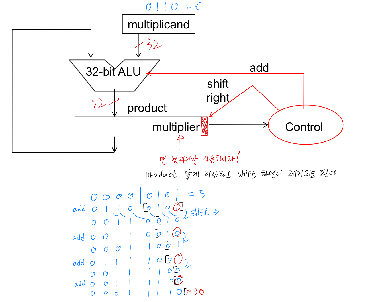 중요한 점은 승수의 최하위 비트(Multiplier0)는 피승수를 곱 레지스터에 더할지 말지를 결정한다.