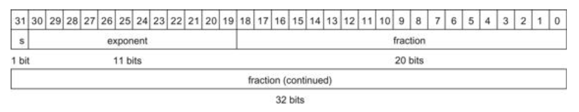 2배 정밀도 부동소수점의 수를 표현하려면 다음과 같이 MIPS 워드 2개가 필요하다