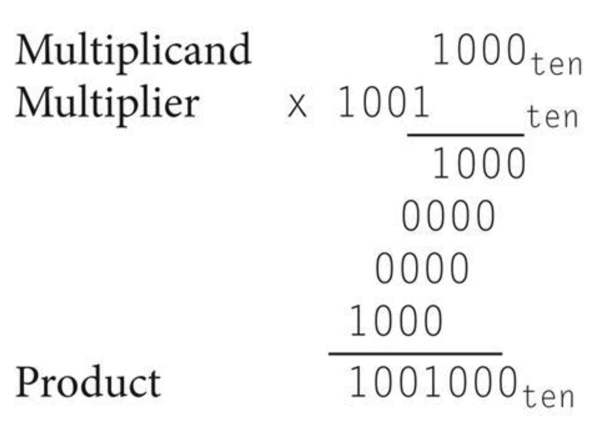 일반적으로 수학에서 우리가 곱셈을 할때 승수의 자릿수를 오른쪽에서 왼쪽으로 가면서 한 번에 하나씩 택해서 이것을 피승수와 곱한 뒤 그 곱셈의 결과를 직전의 곱보다 한 자리 왼쪽에 놓는다.