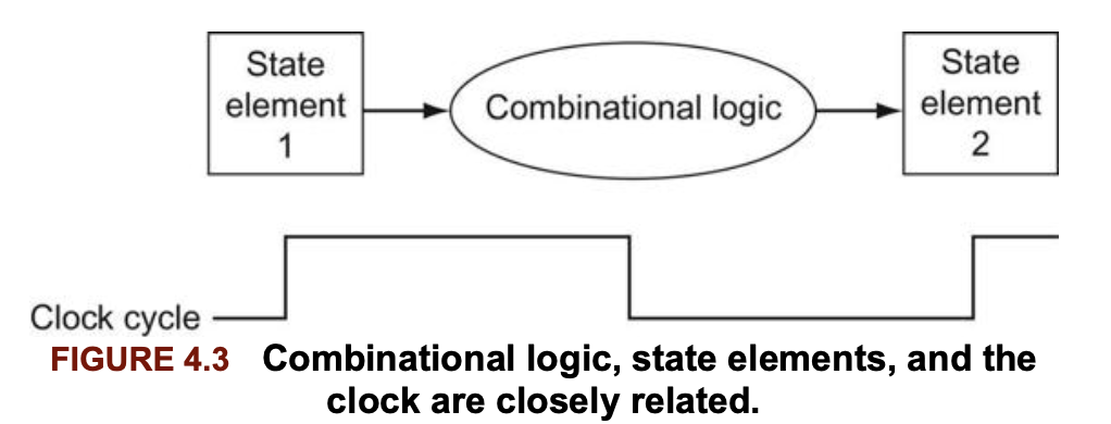 그림 4.3은 조합 회로를 둘러싸고 있는 2개의 상태 소자를 보여주고 있다. 이 회로는 하나의 클럭 사이클에 동작한다.
