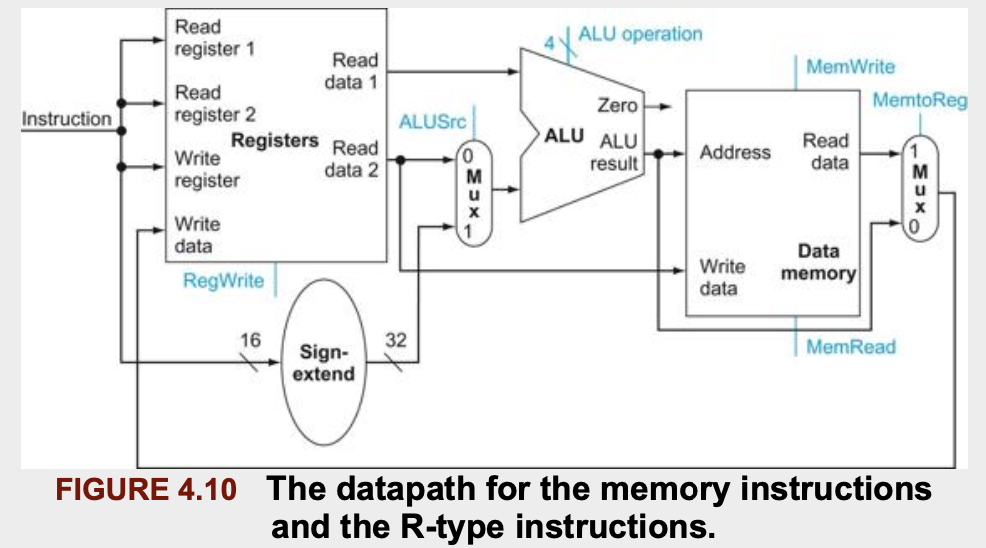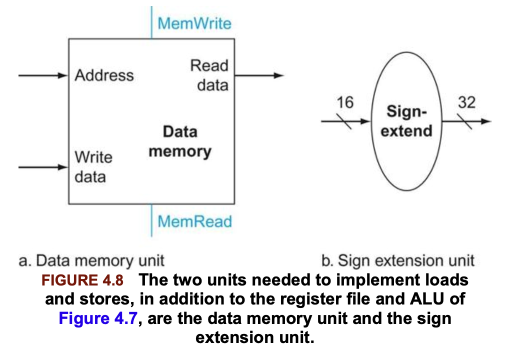 그 외에도 명령어의 16비트 변위 필드 값을 32비트 부호있는 값으로 부호 확장(sign-extension)하기 위한 유닛이 필요하며 또 읽고 쓸 데이터 메모리가 필요하다.