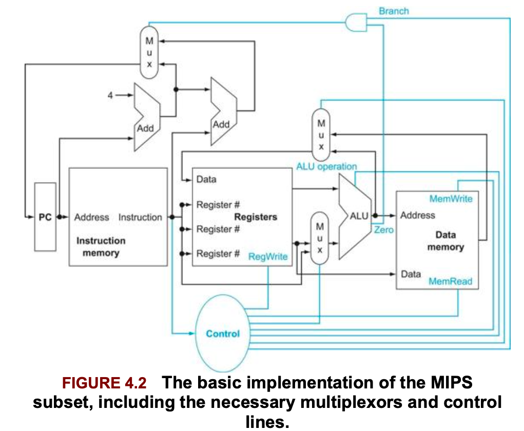 PC에 들어갈 값은 두 덧셈기 중 하나에서 나오고, 레지스터 파일에 쓰일 데이터는 ALU나 데이터 메모리에서 나오며, ALU의 두 번째 입력은 레지스터나 명령어의 수치 필드에서 나온다.