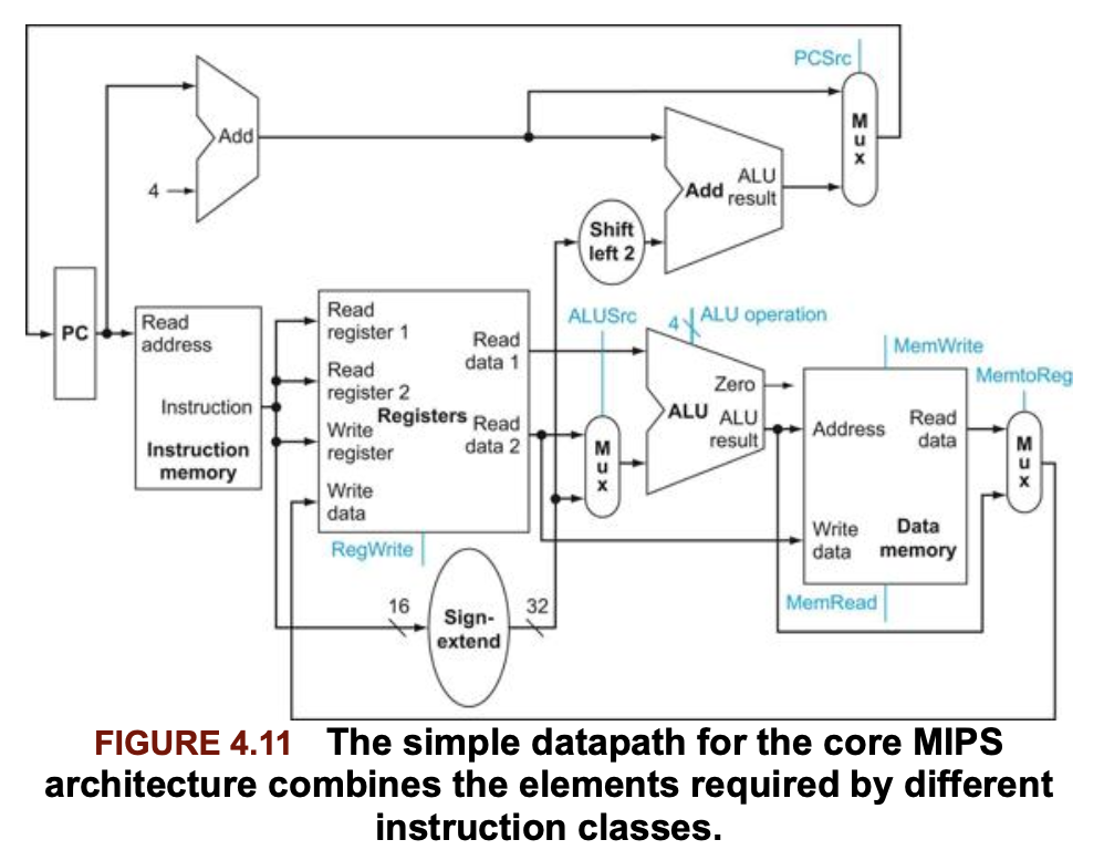 이제 명령어 인출을 위한 데이터패스, R타입 명령어와 메모리 명령어를 위한 데이터패스, 분기 명령어를 위한 데이터패스를 하나로 합쳐서 MIPS 구조를 위한 단순화된 데이터패스를 만들 수 있다.
