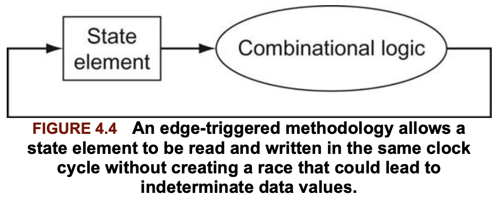 그림 4.4에서 보는 바와 같이 에지 구동 방법론은 레지스터 내용을 읽고 그 값을 조합 회로로 보내고 같은 레지스터에 쓰는 작업 모두가 한 클럭 사이클에 일어나는 것을 허용한다.