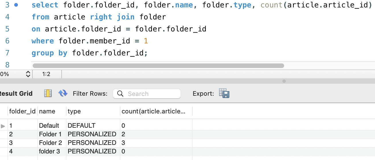 원하는 것처럼 1번의 쿼리로 folder_id, name, type, count를 조회하게 되었습니다.