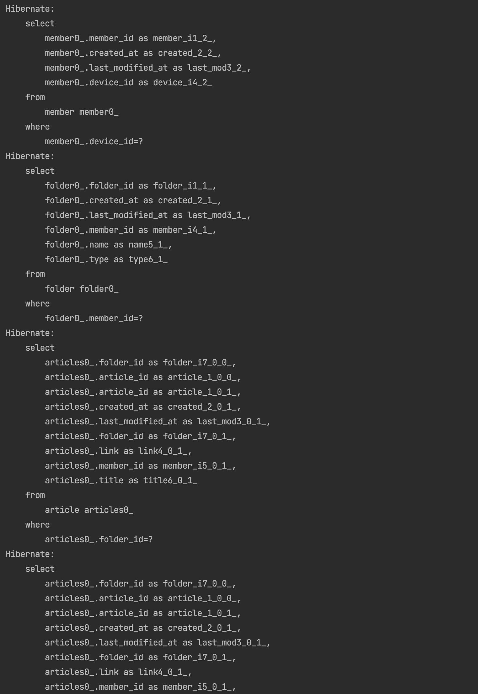 다음과 같이 Folder 전체를 조회하는 쿼리와 각각의 Folder가 본인들의 article을 조회하는 쿼리가 4개 추가적으로 발생한 것을 알 수 있었습니다.