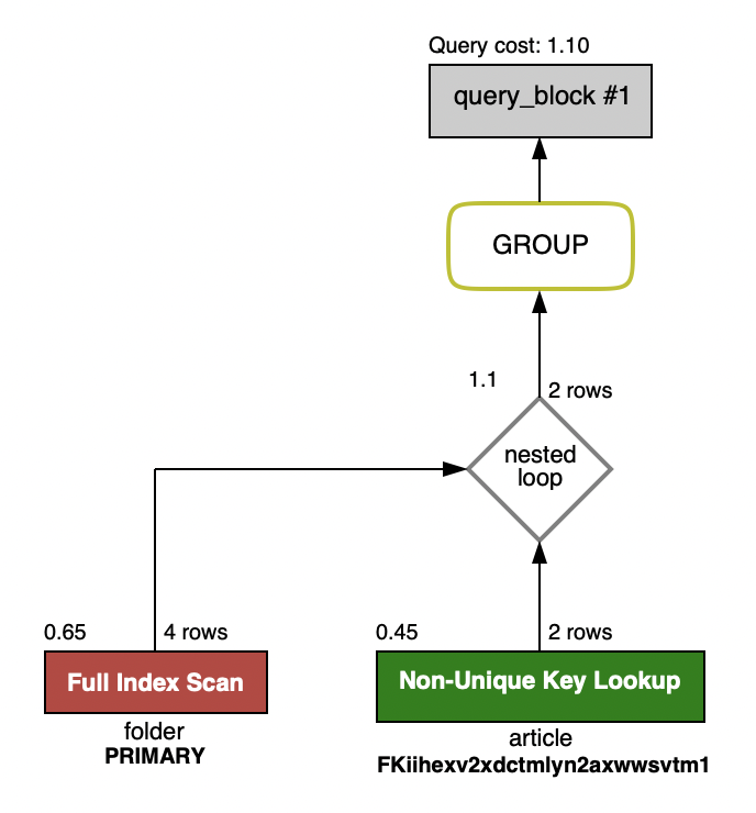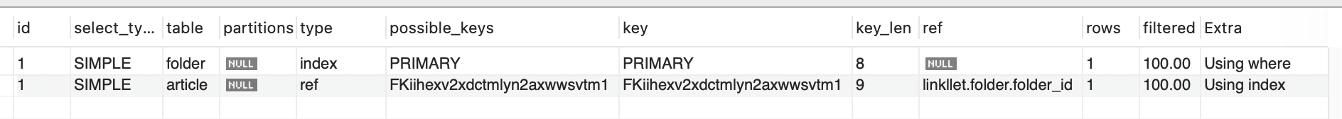 또한 type에서 index로 명시된 것으로 보아, index full scan방식을 사용하여 선행테이블(folder)을 조회한 후 -> 후행 테이블인 article에서 ref로 처리하는 것 을 알 수 있습니다.