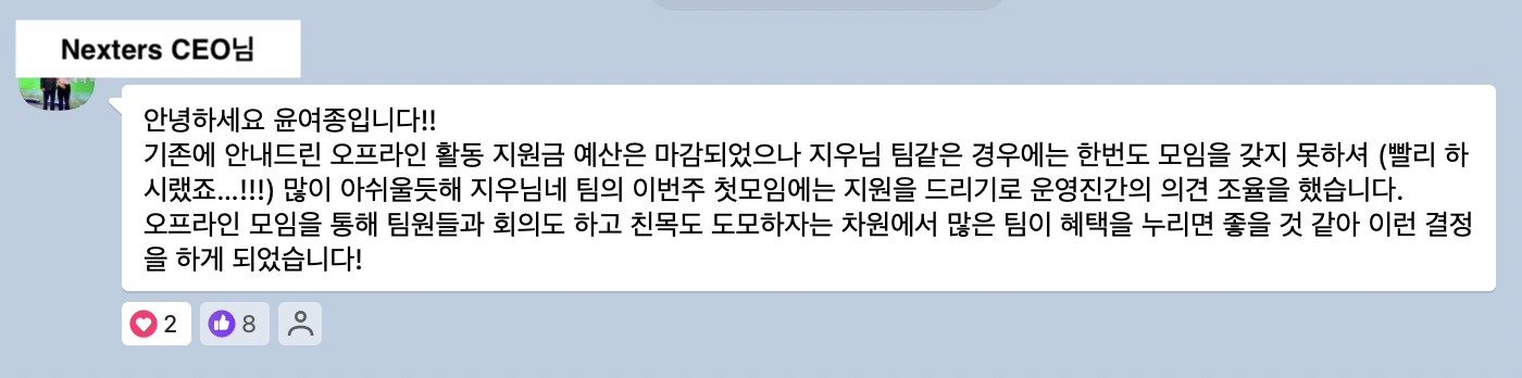 Nexters 23기 같은 경우 팀원들이 정규 세션 이외의 시간에 모여 협업을 진행하는 경우 인당 1만 원 정도의 지원금이 나온다!