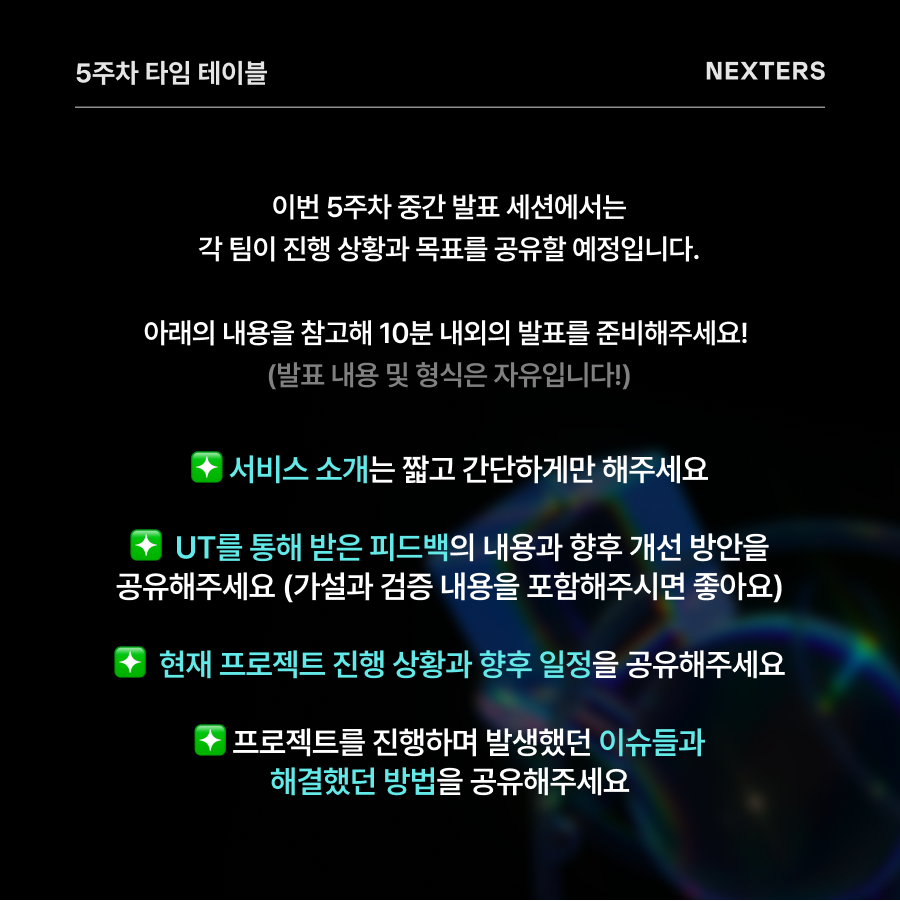 이번 주차의 경우 각 팀별로 중간 점검을 함과 동시에, 발표를 진행하는 시간이었다!