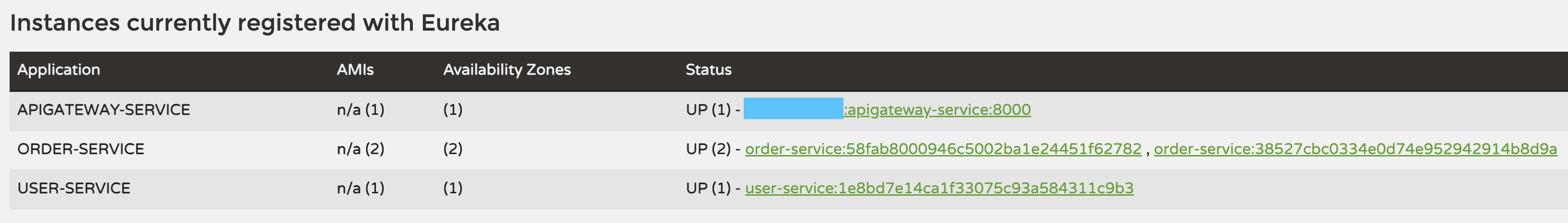 우선 다음과 같이 Api-gateway 1개, order-service 2개, user-service 1개가 기동 중이다.
