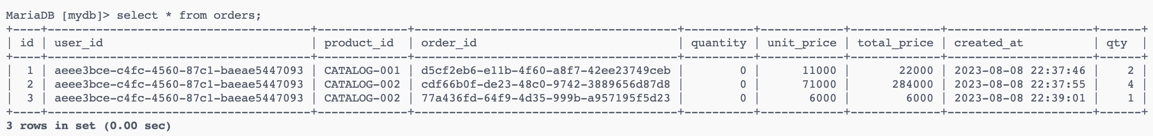 총 3번의 주문 API를 호출하였다. 다음 호출 순서대로 로그에 남게 된다.