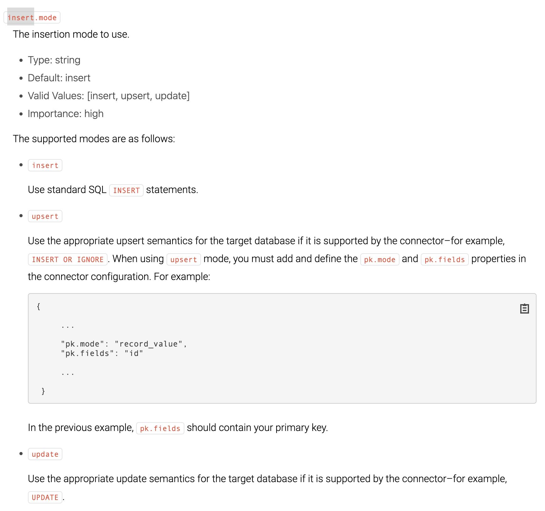 kafka의 경우 sink connector를 생성할 때, insert.mode를 이용하여 insert를 할지 update를 할지 선택할 수 있다고 한다.
