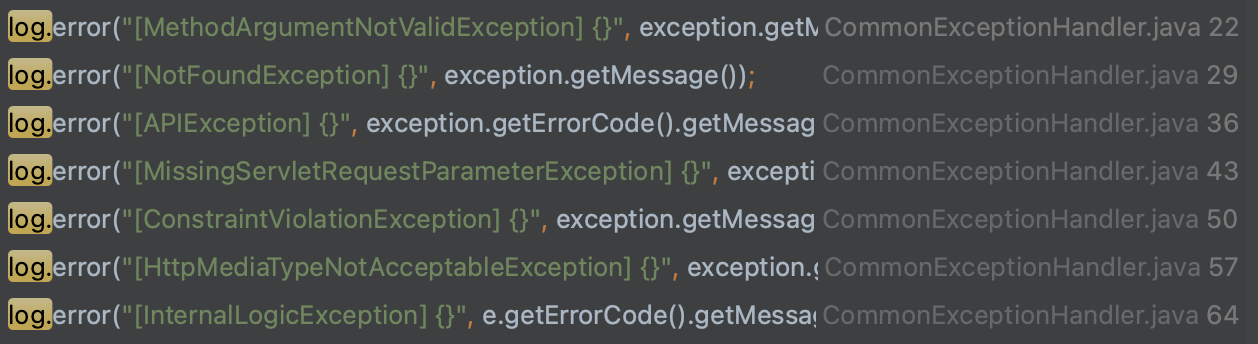 다음 CommonExceptionHandler에서 남기고 있는 로그의 목록을 살펴보자!