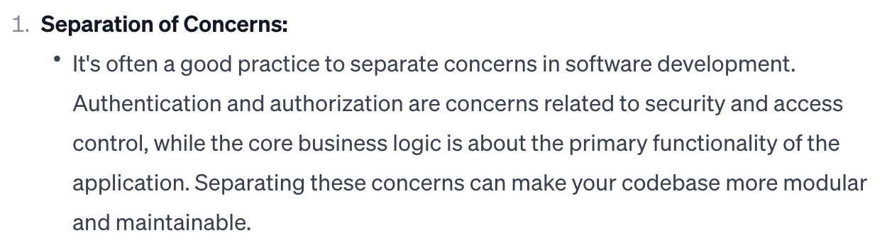 관심사를 분리하는 것이 핵심이며, 인증 및 권한 부여는 보안 및 액세스 제어와 관련된 문제인 반면, 핵심 비즈니스 로직은 애플리케이션의 주요 기능에 관한 것이라는 의미에 100% 동의한다.