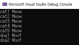 위의 코드를 보면 main에서 신기한 행동을 하고있다. 생성된 Cat과 Dog의 instance(object)의 주소를 부모 class인 Animal 포인터 변수에 저장한후, -> 연산을 통해 speak()함수를 호출하고 있다. 결과값으로는 다음과 같다.