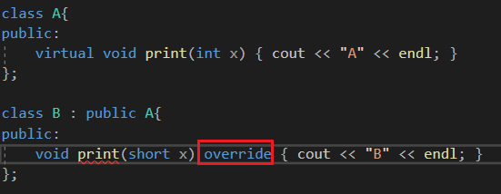 밤샘코딩을 하던도중 위의 코드와같이 실수를 했다 생각해보자. A를 상속받는 class B 내부의 오버라이드(override) 된 함수에 매게변수로 실수로 short 형을 선언한것이다. compiler는 이렇게 매게변수가 다른경우 override하는 것 이 아니라, 오버로딩(overloading)을 하는줄 알고 A를 출력한다.