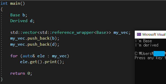 std::vector<std::reference_wrapper<Base>> my_vec; 을 사용하면, my_vec은 Base의 reference를 갖는 vector가 된다. 추가적으로 include <funtional>을 포함시켜줘야 한다.