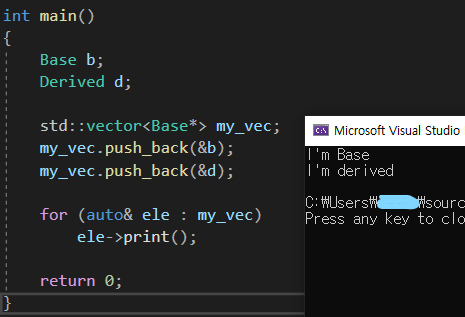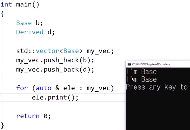 위의 코드에서는 Base의 객체 b, Derived의 객체 d를 my_vec에 push_back() 으로 넣어주고있다. 이후 for-each문을 통하여 print를 통해 출력하니 "I'm Base"가 2번 출력되는것을 확인할 수 있었다. 이것이 의미하는 바가 무엇인가? 이는 push_back으로 b와 d를 전달하였지만, <Base> vector로 들어가는 과정에서 b는 잘 전달됬지만, Derived d의 내용은 잘려나간것 이다.