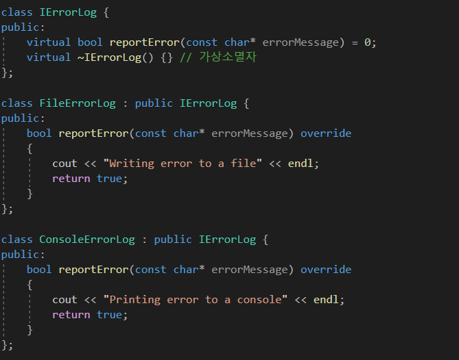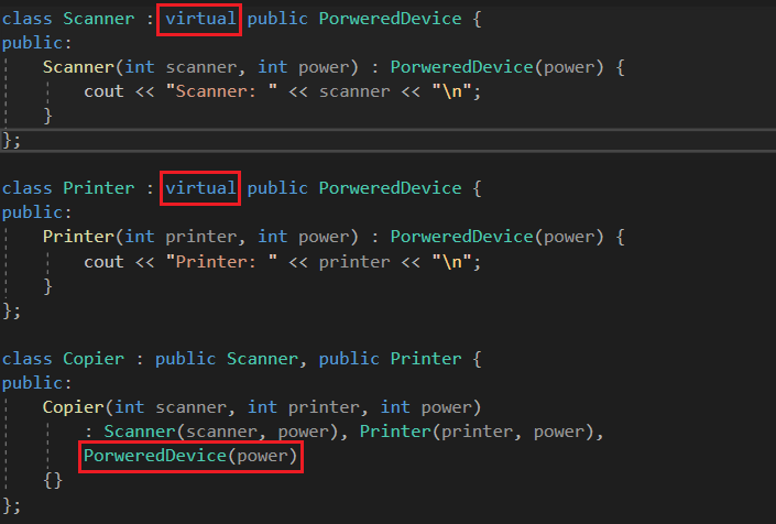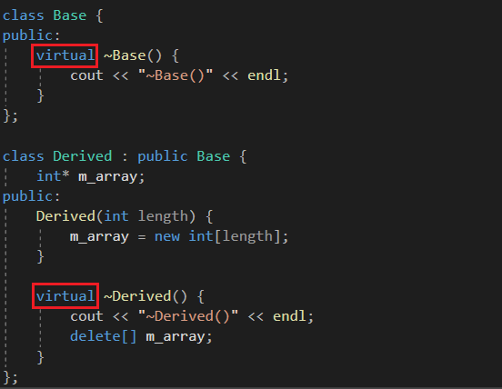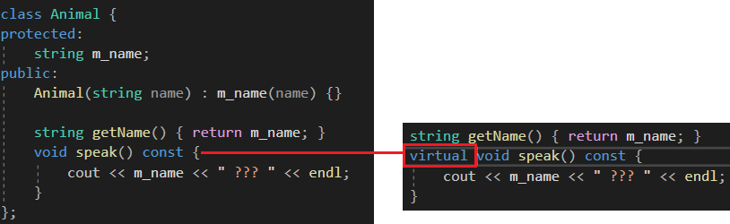 이를 해결하기 위해서는 vitual을 추가해주면 된다. 어디에 추가 해야하는지는 다음 코드를 살펴보자.