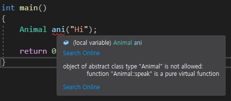 my_animals라는 Animal*형 포인터 변수 배열을 만들어 각 동물들의 주소를 저장한후, 부모 class의 멤버함수인 speak()을 호출하면 위에서 배운대로 7마리 모두 ??? 가 출력될 것이다. 이는 자기가 Animal class인줄 알아 발생하는 현상이다.