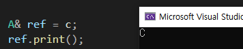 위의 코드는 A, B, C, D가 연속적으로 상속구조를 구성하고있다. 이전시간에는 포인터 변수를 활용했지만, 이번에는 reference를 사용한다. main함수를 보면 A &ref로, A의 reference에 b를 대입하고있다. 그리고 참조변수 ref를 통해 print문을 출력하면 A가 출력된다. 추가적으로 c나 d를 대입해도 A가 출력된다. 이유는 추후 설명해주신다 하셨다. 아마 upcasting이 일어나 이런결과가 나오는 것 같다.