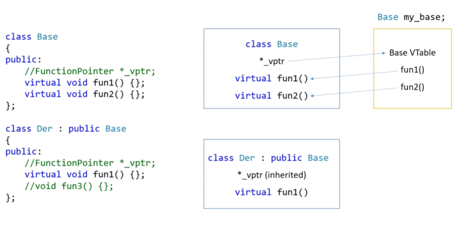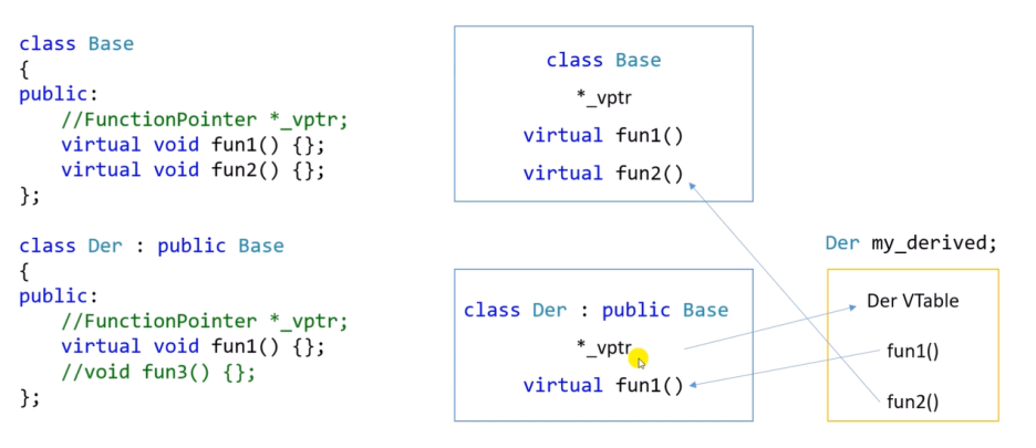 추가적으로 오버라이딩 되는 함수들은 return type이 같아야 한다. 함수이름과 parameter가 같은데 return type이 다른경우 부모 class와 다르다며 경고를 보여주고, compile되지 않는다. 또 추가적으로 가상함수는 일반함수들처럼 stack을 사용하지 않는다. 가상함수 호출시 테이블표를 확인하며 이 테이블표를 보고 해당 함수를 찾아가는 과정이 있다. 따라서 중복문 안에 가상함수를 선언해주면 상당히 느려지는 현상을 볼수 있다.