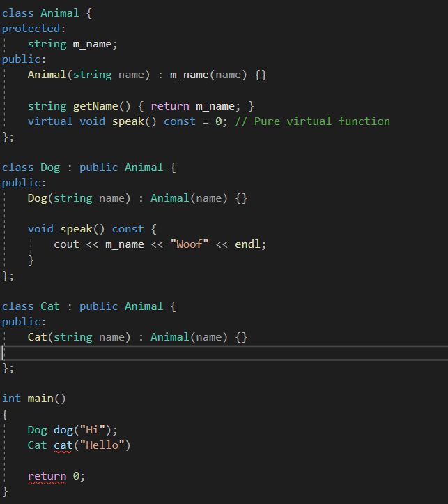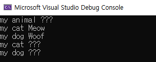 1행의 animal 객체에서 ???의 출력은 당연하다. 2행과 3행의 cat과 dog의 Meow와 Woof또한 당연하다. 하지만 마지막 2줄의 결과인 ??? 은 무엇이란 말인가? m_name은 정상출력 되고있다. 하지만 speak함수의 경우 부모class의 함수가 호출되고 있다.