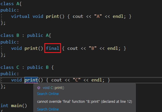 A에서는 가상함수이고, B안에서 final을 선언하여 override를 끊은 상태이다. 이후 C에서 같은 이름으로 함수를 override하려 드니 에러가 발생한다.