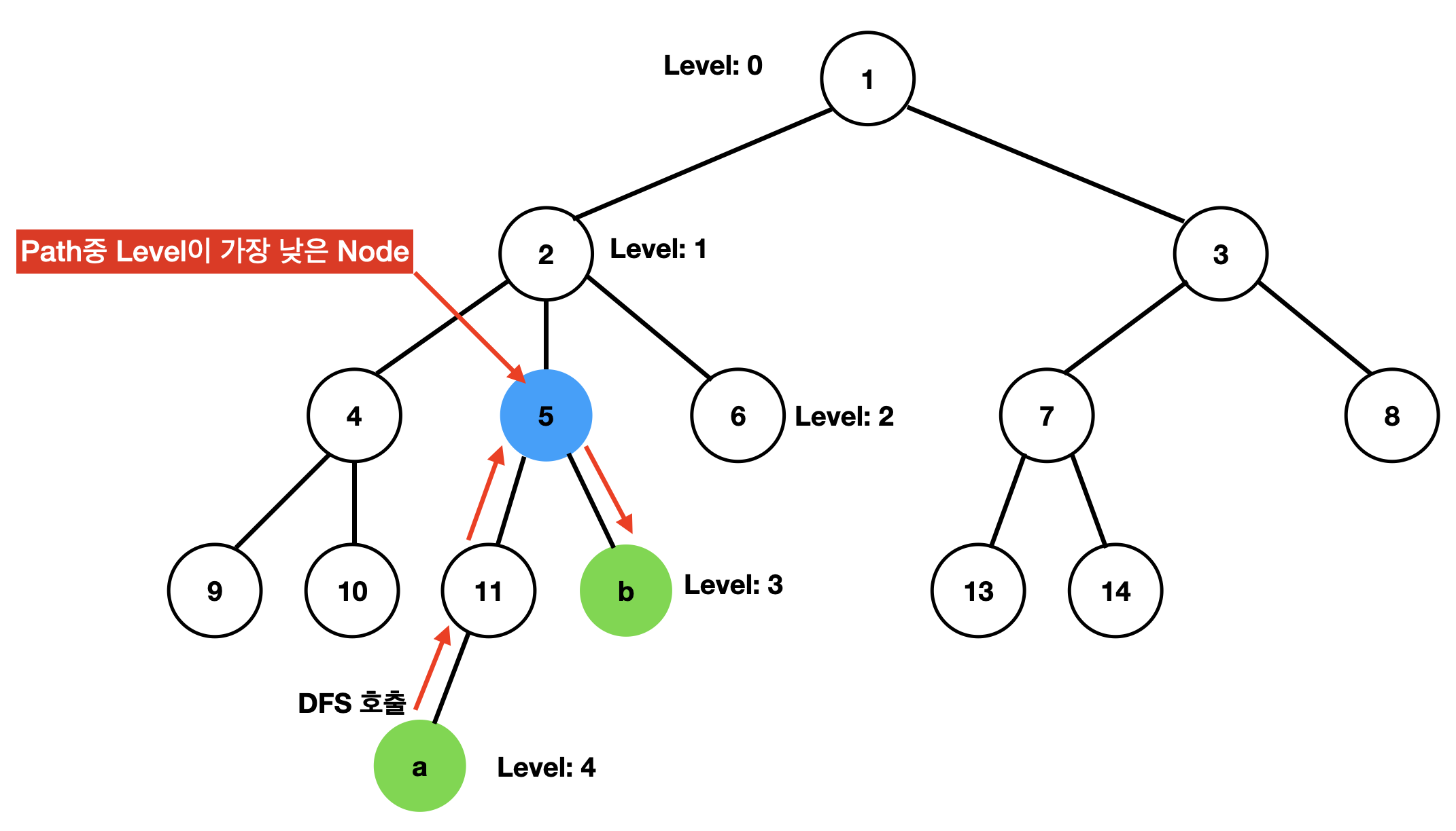 - 해당 Path를 방문하면서 저장된 Node들 중 Level이 가장 작은 값을 갖는 Node가 LCA이다.