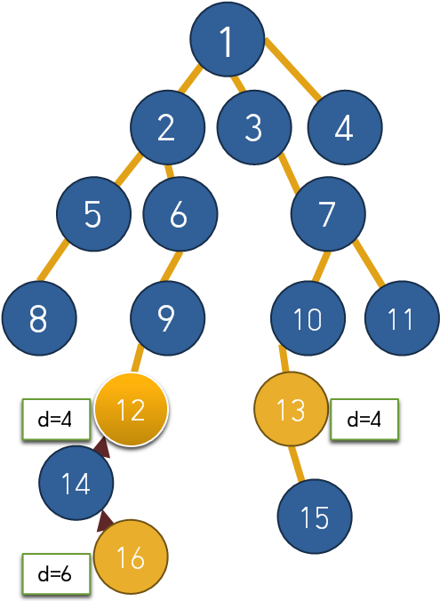 두 비교 노드의 높이 중 더 낮은 Level 4로 동일하게 만들면 각각 12와 13번 노드가 된다.