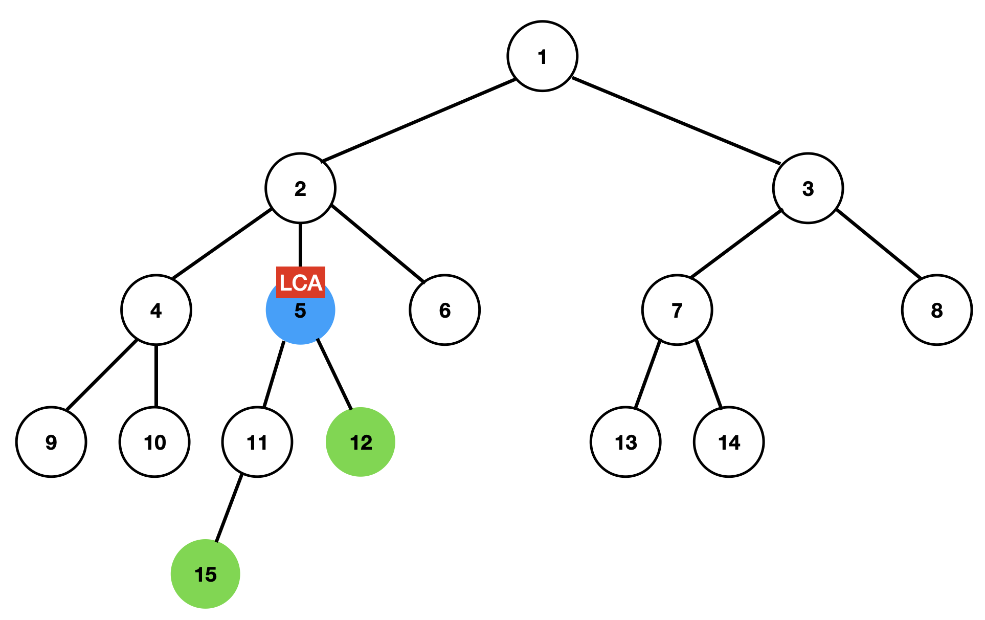 예를 들어 다음 그림과 같은 트리가 있다고 했을 때, 12번과 15번 노드의 최소 공통 조상 LCA는 5번 노드가 됩니다.