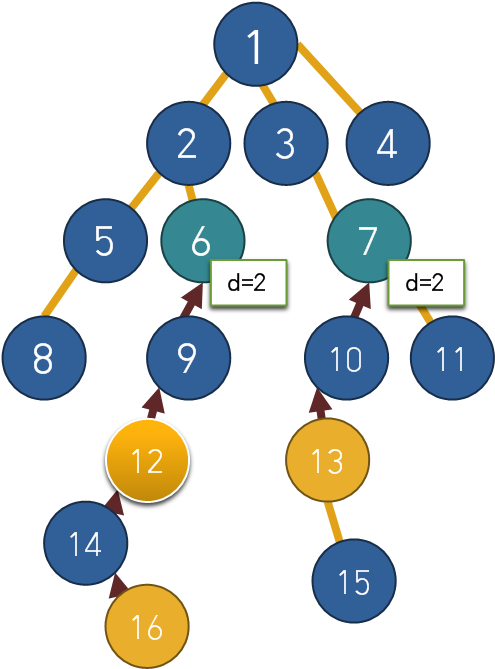다음으로 2^1만큼 위에 있는 조상을 비교하면 6과 7로 처음으로 다른 값이 나오며, 해당 6과 7로 각각 이동하게 됩니다.