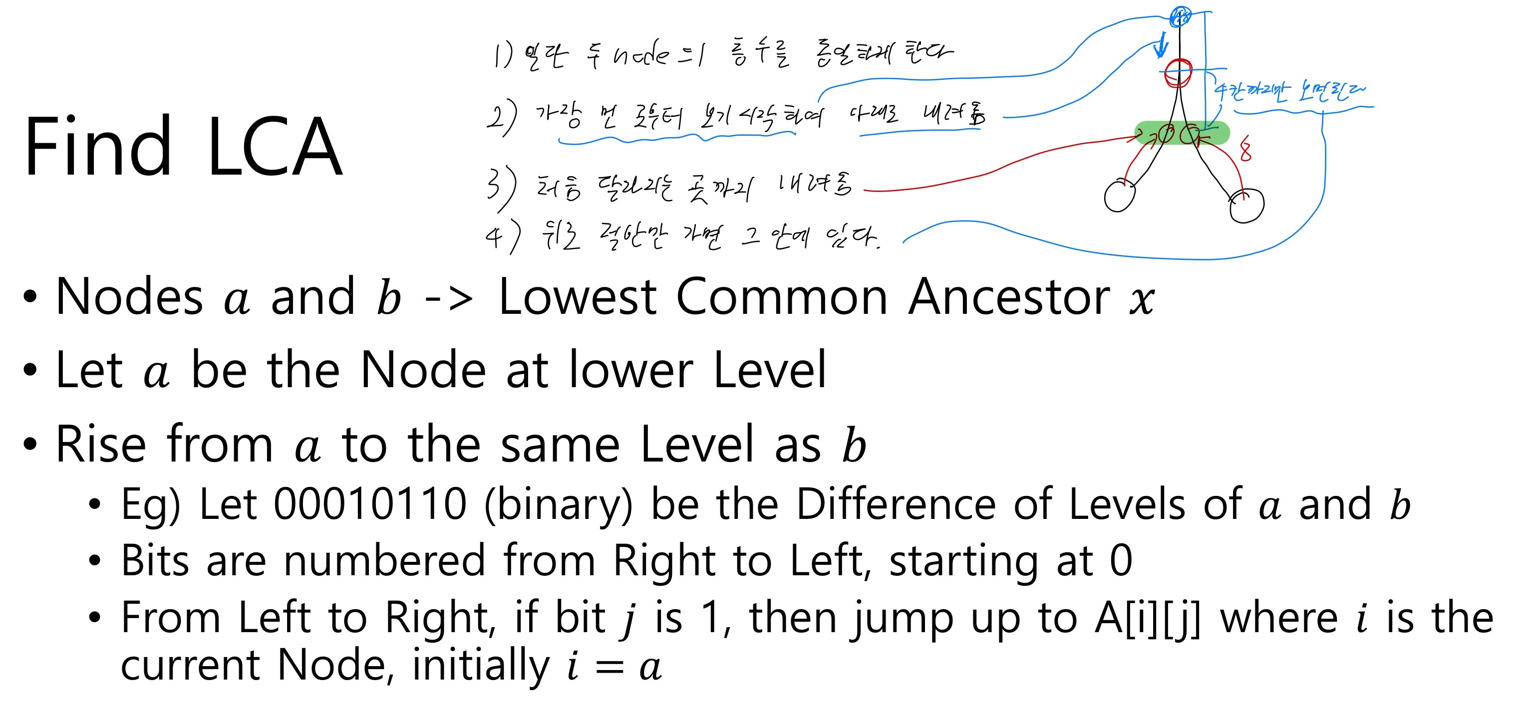 - 비교하는 노드의 번호가 같다면, 즉 (a로부터 2^j만큼 떨어진 조상) == (b로부터 2^j만큼 떨어진 조상)이라면 2^(j-1) 승을 다시 비교한다.