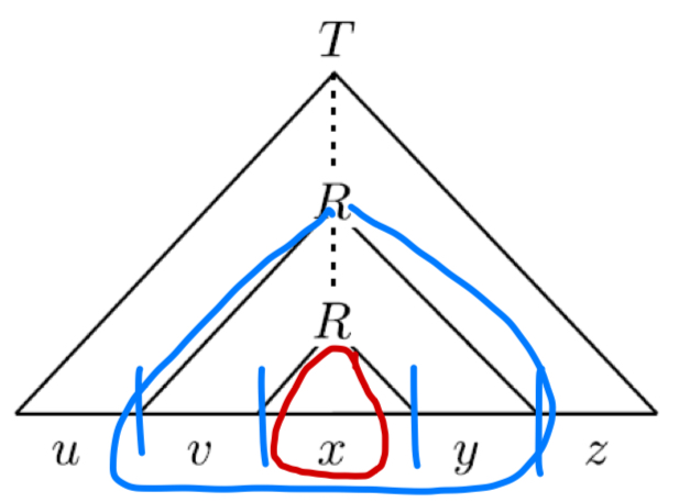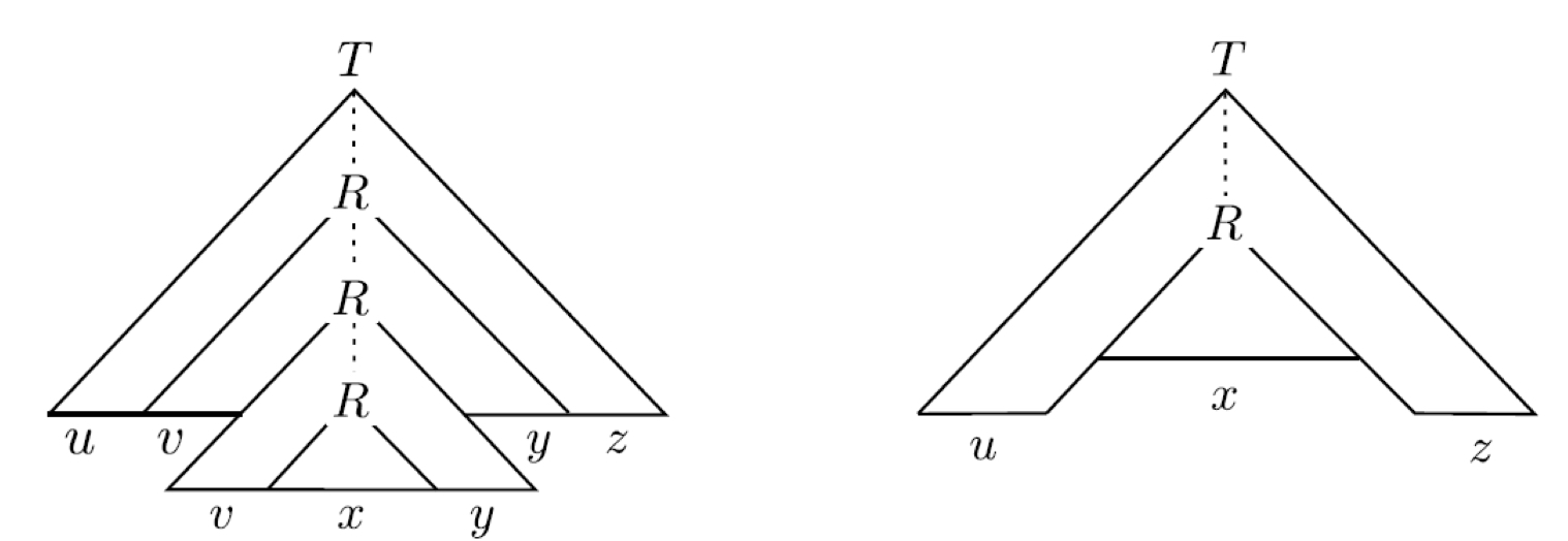 R이 나타내는 큰 subtree는 vxy를 생성하고, 작은 subtree는 x만을 생성합니다. 다음 그림을 보시죠!