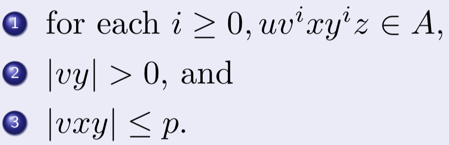 또한 그러한 S는 5조각, 즉 S = uvxyz로 나눌 수 있으며, 다음 조건을 만족한다.