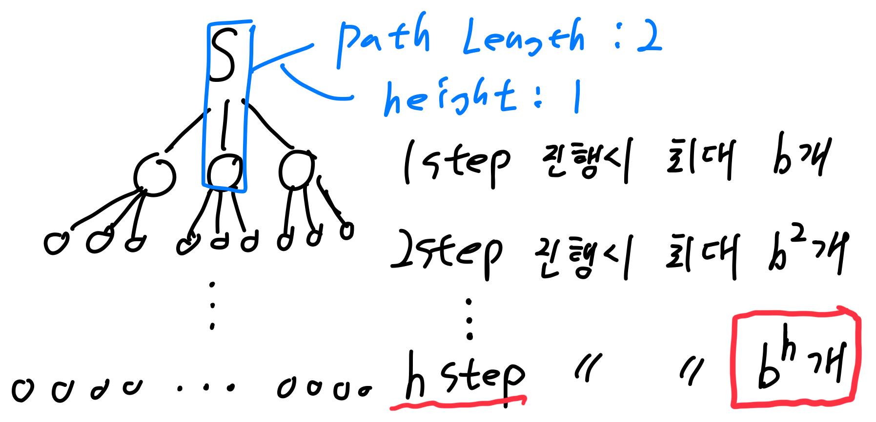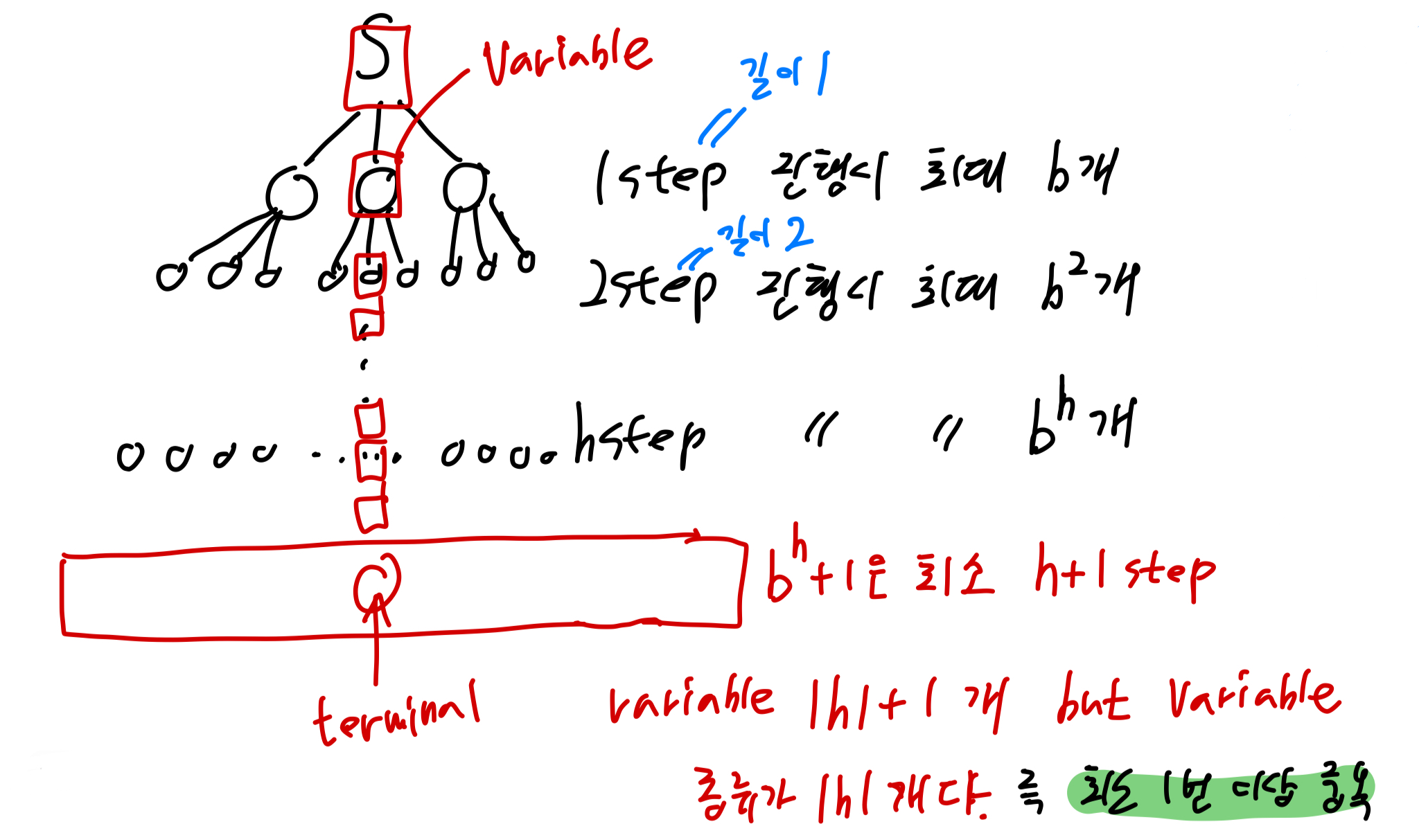 다시말해서, parse tree의 Level 1은 최대 b개의 자식을 갖을 수 있으며, Level 2는 최대 b^2개, Level 3은 최대 b^3개, ... , Level h는 최대 b^h개의 단말 노드를 갖게된다.