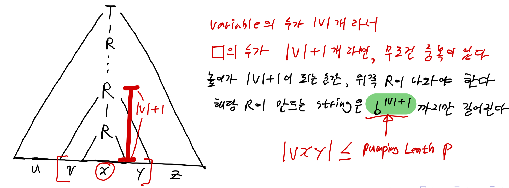 만약 CFL A에 포함된 String S의 길이가 P이상이라면, 해당 CFG의 parse tree는 최소 |V| + 1 만큼의 높이를 갖어야 합니다.