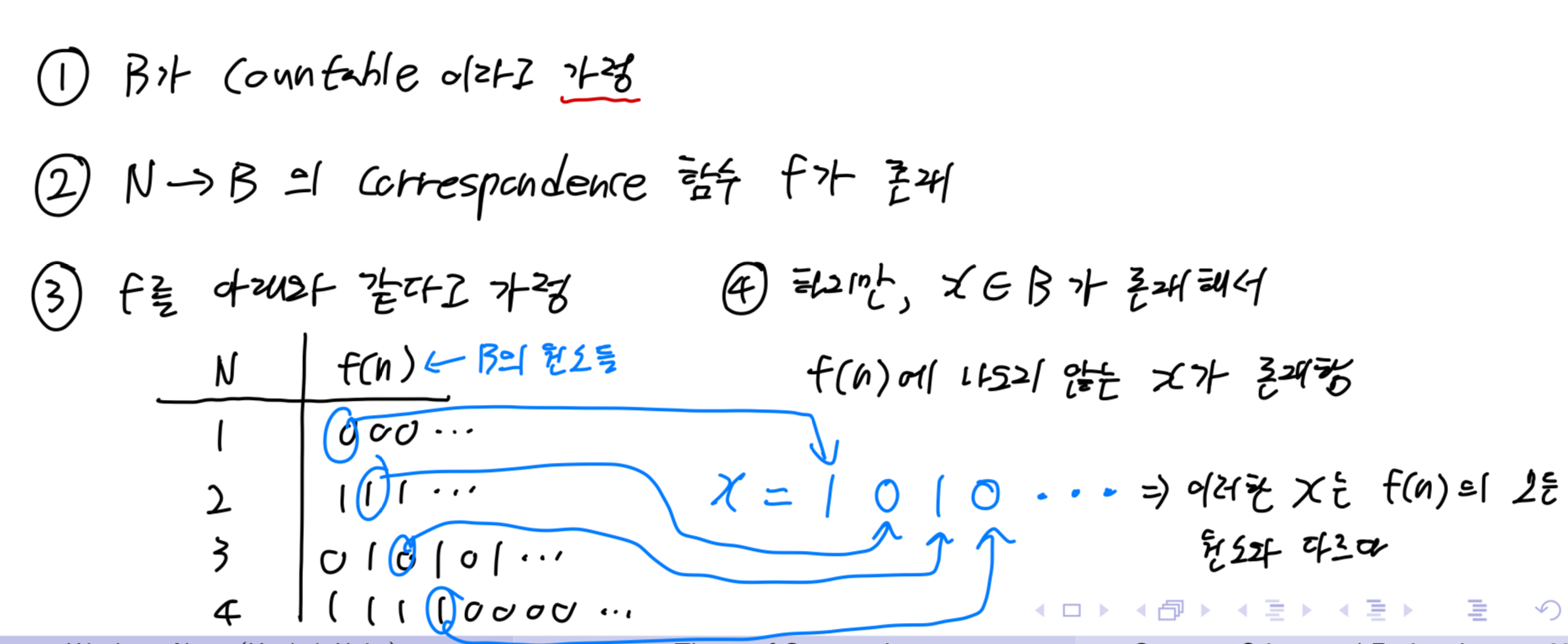 우리는 대각화 + 귀류법 을 통하여 B가 uncountable함을 보일 것 이다.