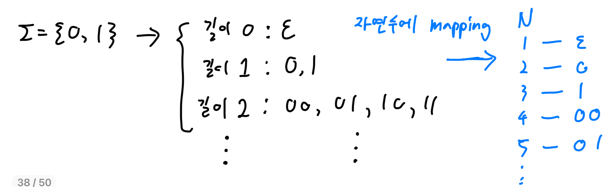모든 자연수 1, 2, 3, ... N에 대하여 mapping가능한 하나의 String을 지정할 수 있으니, 즉 ∑*는 자연수와 같다 할 수 있다.
