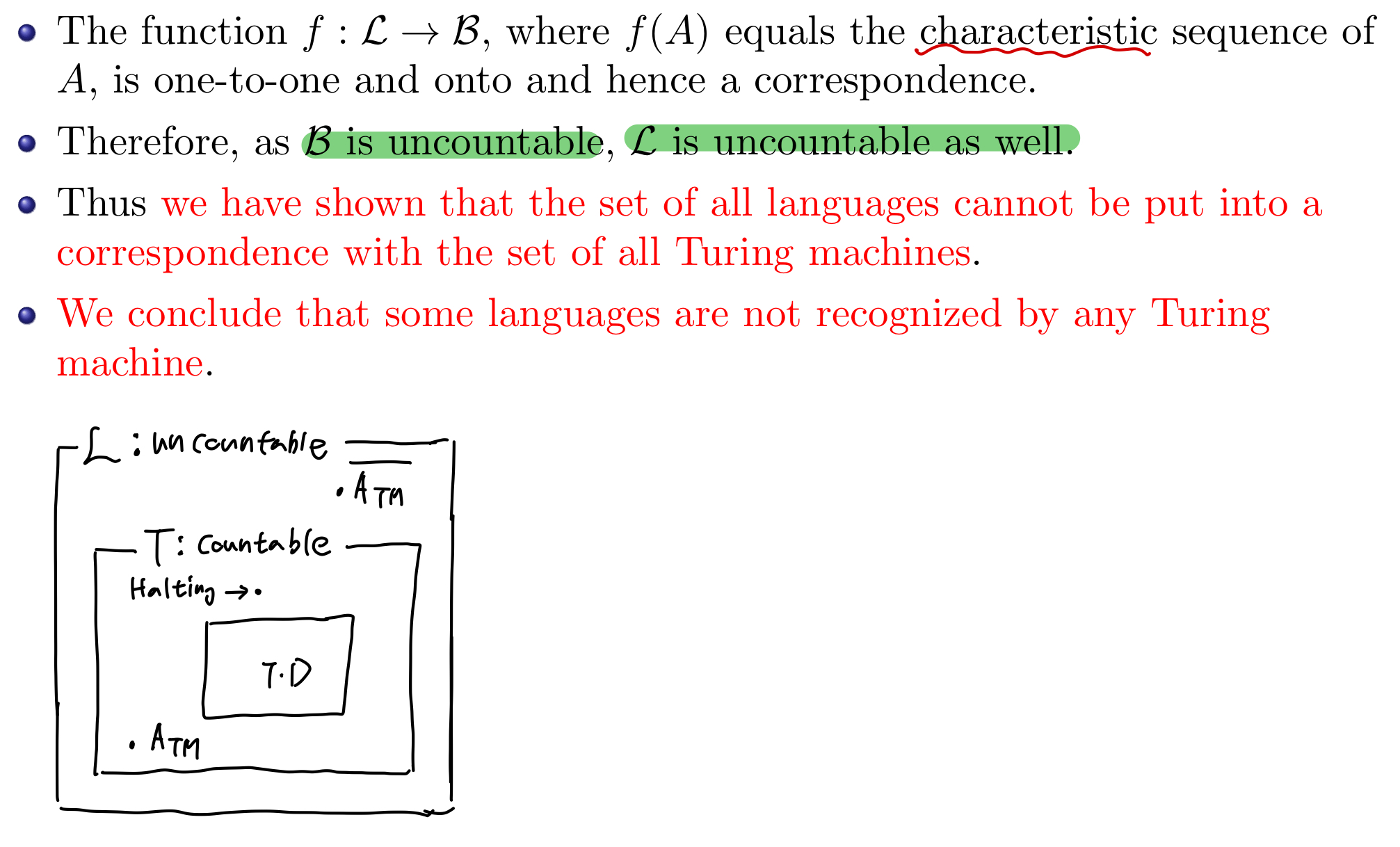 |∑*| 와 |Turing Machine, T| 은 둘다 countable로 자연수 N과 mapping이 되지만, ∑*에는 T와 mapping되지 않는 것도 분명 존재한다. 즉, T의 수는 적어도 |∑*| 보다 커지지는 않는다.