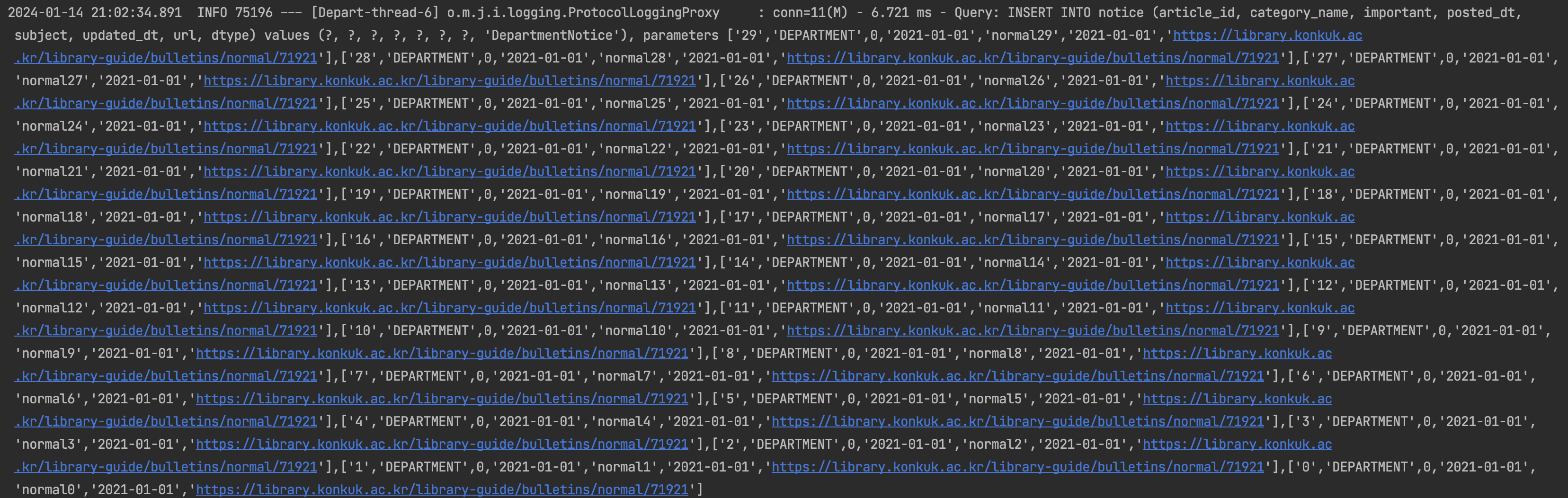 [main] MySQL : [QUERY] ... (truncated) [Created on: Sun Jen 21 11:34:10 KST 2024, duration: 3, connection-id: 325, statement-id: 0, resultset-id: 0, at com.zaxxer.hikari.pool.ProxyStatement.executeBatch(ProxyStatement.java:128)] - MariaDB 드라이버 : 기본값이 1024 로 지정되어 있습니다. MySQL 드라이버와는 달리 0으로 지정시 쿼리의 글자 제한이 무제한으로 설정됩니다.