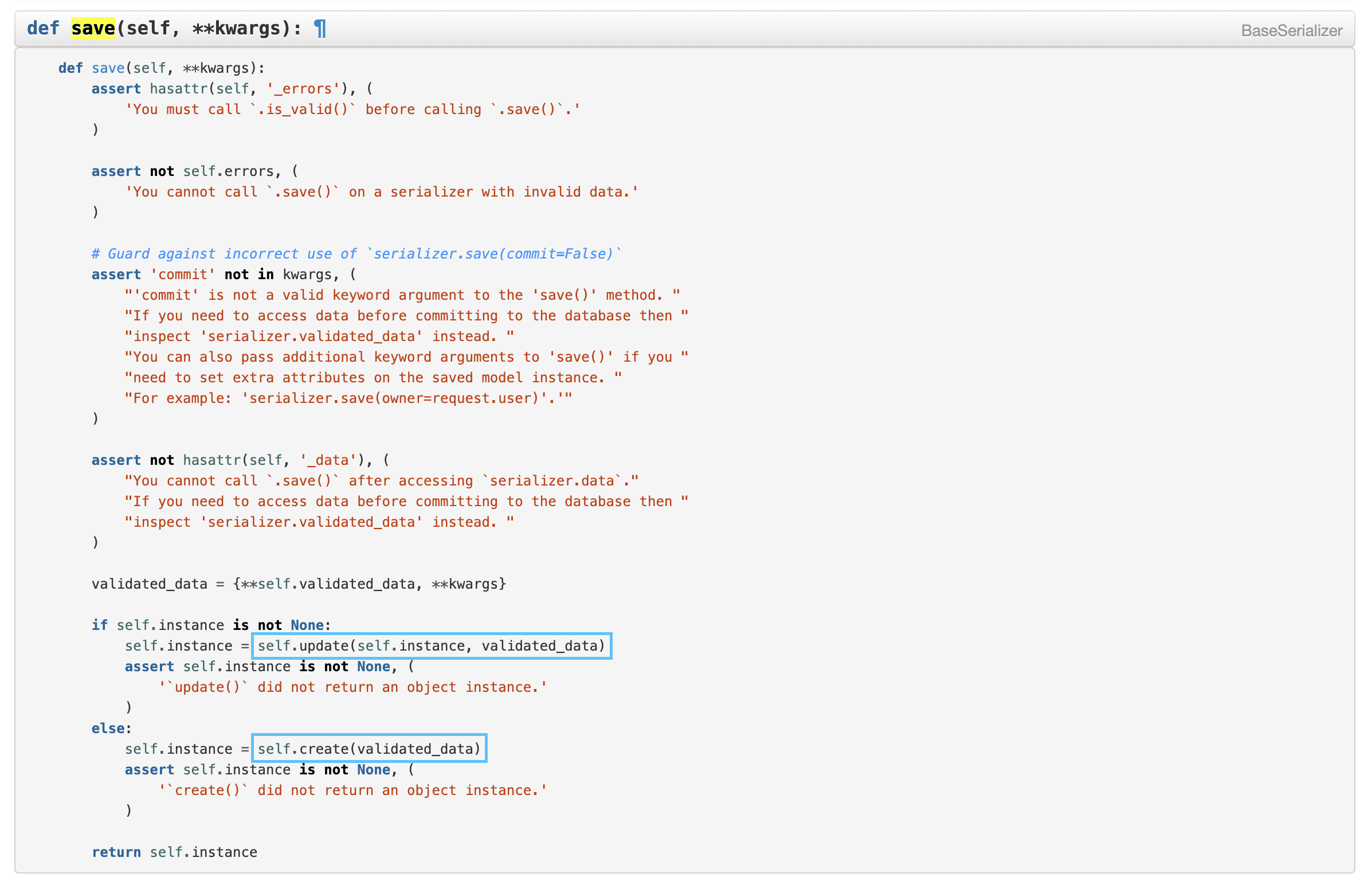 다만, create(), update()를 직접적으로 호출하는 방식이 아니라, save() 메서드를 호출하면 Serializer가 전달받은 Request를 기반으로 인스턴스를 생성할 때 넘겨받은 argument에 따라서 create()가 호출될지? update()가 호출될지? 가 결정되는 방식이더군요...