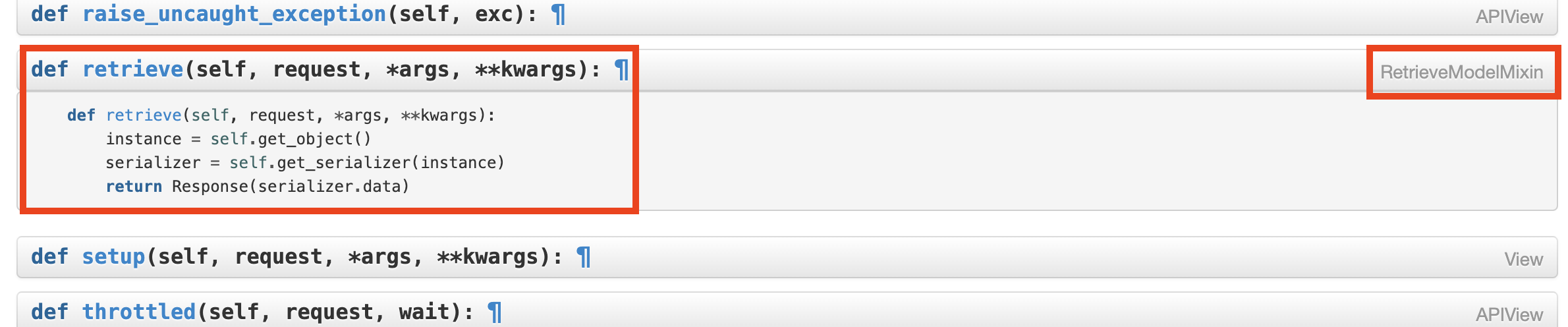 그러면 기존에 DRF의 RetrieveAPIView에 있던 retrive를 다음과 같이 오버라이드 해줘야 합니다.