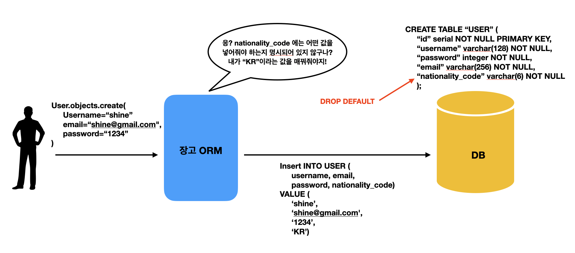 위 그림처럼 DEFUALT라는 옵션을 제어하는 주체가 다르다. Django는 DB에 입력하는 데이터를 스스로 제어하고 싶어 합니다!